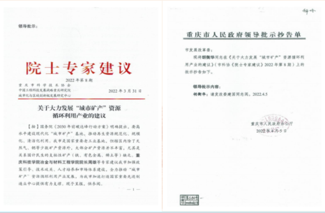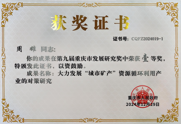 5. 团队撰写的《关于大力发展“城市矿产”资源循环利用产业的建议》被市科协《院士专家建议》2022年第8期单篇采用,获市委副书记、市长胡衡华肯定性批示。2024年获第九届重庆市发展研究奖壹等奖。相关署名文章《多方着手,促进“城市矿产”资源循环利用》在《科技日报》上发表。