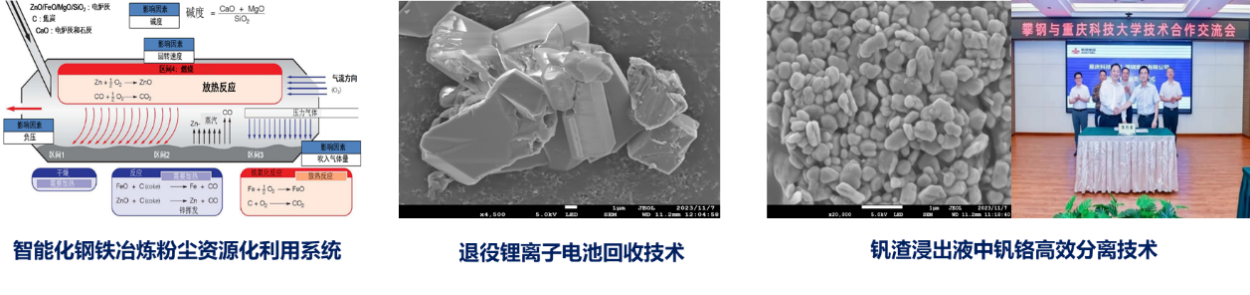 (1)智能化钢铁冶炼粉尘资源化利用系统,对炼钢粉尘中Fe、Zn、Pb元素回收率99%;已和中冶赛迪达成科技成果转化(技术支持和14项专利许可),中标营口20万吨/年除尘灰综合利用工程。